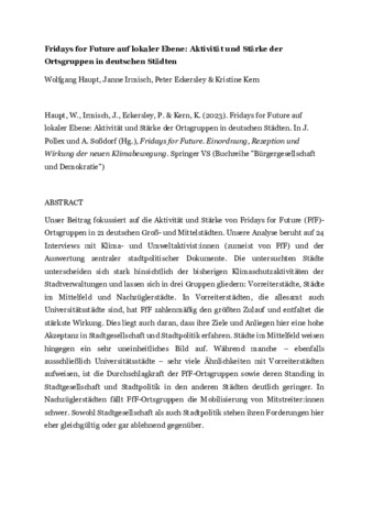 Unser Beitrag fokussiert auf die Aktivität und Stärke von Fridays for Future (FfF)-Ortsgruppen in 21 deutschen Groß- und Mittelstädten. Unsere Analyse be-ruht auf 24 Interviews mit Klima- und Umweltaktivist:innen (zumeist von FfF) und der Auswertung zentraler stadtpolitischer Dokumente. Die untersuchten Städte unterscheiden sich stark hinsichtlich der bisherigen Klimaschutzaktivitä-ten der Stadtverwaltungen und lassen sich in drei Gruppen gliedern: Vorreiter-städte, Städte im Mittelfeld und Nachzüglerstädte. In Vorreiterstädten, die alle-samt auch Universitätsstädte sind, hat FfF zahlenmäßig den größten Zulauf und entfaltet die stärkste Wirkung. Dies liegt auch daran, dass ihre Ziele und Anlie-gen hier eine hohe Akzeptanz in Stadtgesellschaft und Stadtpolitik erfahren. Städte im Mittelfeld weisen hingegen ein sehr uneinheitliches Bild auf. Während manche – ebenfalls ausschließlich Universitätsstädte – sehr viele Ähnlichkeiten mit Vorreiterstädten aufweisen, ist die Durchschlagkraft der FfF-Ortsgruppen sowie deren Standing in Stadtgesellschaft und Stadtpolitik in den anderen Städ-ten deutlich geringer. In Nachzüglerstädten fällt FfF-Ortsgruppen die Mobilisie-rung von Mitstreiter:innen schwer. Sowohl Stadtgesellschaft als auch Stadtpoli-tik stehen ihren Forderungen hier eher gleichgültig oder gar ablehnend gegen-über.