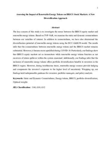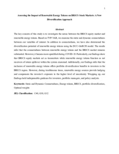 Assessing the impact of renewable energy tokens on BRICS stock markets: a new diversification approach.