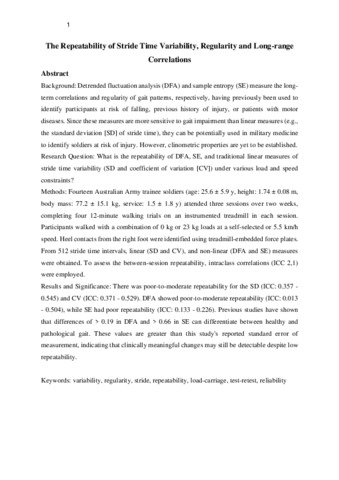 Methods: Fourteen Australian Army trainee soldiers (age: 25.6 ± 5.9 y, height: 1.74 ± 0.08 m, body mass: 77.2 ± 15.1 kg, service: 1.5 ± 1.8 y) attended three sessions over two weeks, completing four 12-minute walking trials on an instrumented treadmill in each session. Participants walked with a combination of 0 kg or 23 kg loads at a self-selected or 5.5 km/h speed. Heel contacts from the right foot were identified using treadmill-embedded force plates. From 512 stride time intervals, linear (SD and CV), and non-linear (DFA and SE) measures were obtained. To assess the between-session repeatability, intraclass correlations (ICC 2,1) were employed.