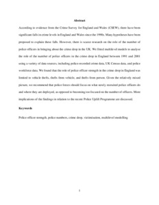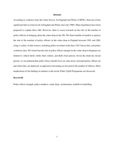 According to evidence from the Crime Survey for England and Wales (CSEW), there have been significant falls in crime levels in England and Wales since the 1990s. Many hypotheses have been proposed to explain these falls. However, there is scarce research on the role of the number of police officers in bringing about the crime drop in the UK. We fitted multilevel models to analyse the role of the number of police officers in the crime drop in England between 1991 and 2001 using a variety of data sources, including police recorded crime data, UK Census data, and police workforce data. We found that the role of police officer strength in the crime drop in England was limited to vehicle thefts, thefts from vehicle, and thefts from person. Given the relatively mixed picture, we recommend that police forces should focus on what newly recruited police officers do and where they are deployed, as opposed to becoming too focussed on the number of officers. More implications of the findings in relation to the recent Police Uplift Programme are discussed.