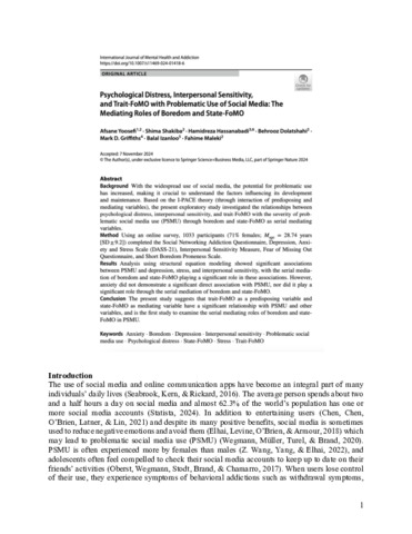 Psychological distress, interpersonal sensitivity, and trait-FoMO with problematic use of social media: the mediating roles of boredom and state-FoMO.