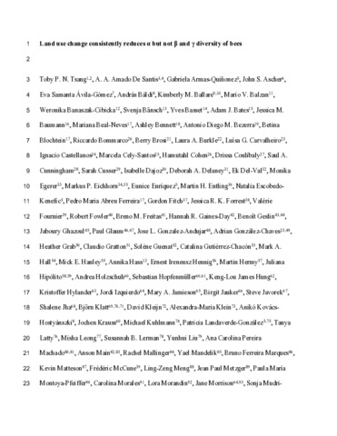 | Rights: | This is the peer reviewed version of the following article: Tsang, T.P.N. and 143 others, 2025. Land use change consistently reduces α‐ but not β‐ and γ‐diversity of bees. Global Change Biology, 31 (1): e70006, which has been published in final form at https://doi.org/10.1111/gcb.70006. This article may be used for non-commercial purposes in accordance with Wiley Terms and Conditions for Use of Self-Archived Versions. This article may not be enhanced, enriched or otherwise transformed into a derivative work, without express permission from Wiley or by statutory rights under applicable legislation. Copyright notices must not be removed, obscured or modified. The article must be linked to Wiley’s version of record on Wiley Online Library and any embedding, framing or otherwise making available the article or pages thereof by third parties from platforms, services and websites other than Wiley Online Library must be prohibited. |