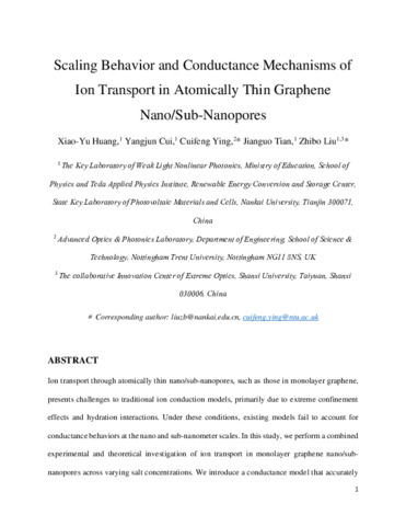 Scaling behavior and conductance mechanisms of ion transport in atomically thin graphene nano/subnanopores.