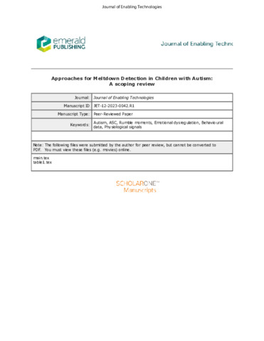Findings: The literature selected for this research explores different methodologies used for detecting precursors of emotional dysregulation (termed meltdown) in individuals with autism. Results suggest that use of multi-modal data is an under researched area, further compounded by the lack of accessible state of the art data sets.