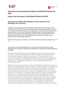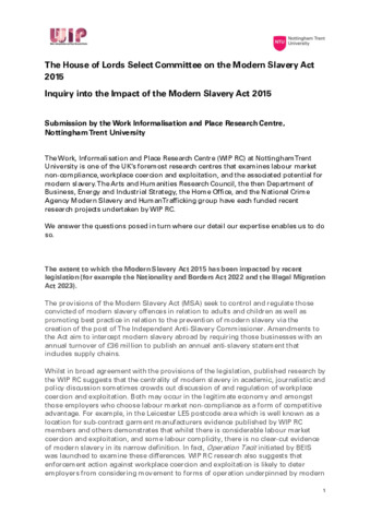 The House of Lords Select Committee on the Modern Slavery Act 2015: inquiry into the Impact of the Modern Slavery Act 2015. Submission by the Work Informalisation and Place Research Centre, Nottingham Trent University.