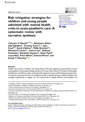Risk mitigation strategies for children and young people admitted with mental health crisis to acute paediatric care: a systematic review with narrative synthesis.