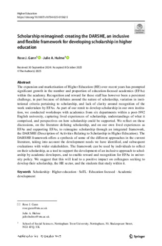 The expansion and marketisation of Higher Education (HE) over recent years has prompted significant growth in the number and proportion of education-focused academics (EFAs) within the academy. Recognition and reward for these staff has however been a persistent challenge, in part because of debates around the nature of scholarship, variation in institutional criteria pertaining to scholarship, and lack of clarity around recognition of the work undertaken by EFAs. As part of our remit to develop scholarship in our own institution, we conducted workshops with academics from six departments within a post-1992 English university, capturing lived experiences of scholarship, understandings of what it comprised, and perspectives on how scholarship could be supported. We reflect on these discussions, on the literature defining scholarship, and on our own lived experiences as EFAs and supporting EFAs, to reimagine scholarship through an integrated framework, the DARSHE (Description of Activities Relating to Scholarship in Higher Education). The DARSHE framework offers a synthesis of some of the different approaches in the current literature, taking into account the development needs we have identified, and subsequent evaluations with wider stakeholders. The framework can be used by individuals to reflect on their scholarship, as a tool to support the development of an inclusive approach to scholarship by academic developers, and to enable reward and recognition for EFAs in university policy. We suggest that this will lead to positive impact on colleagues seeking to develop their scholarship, the HE sector, and the students that study within it.