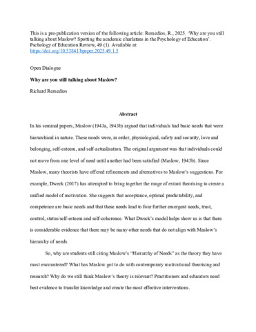 | Rights: | This is a pre-publication version of the following article: Remedios, R. (2025). Why are you still talking about Maslow? Spotting the academic charlatans in the psychology of education. Psychology of Education Review, 49(1), 5-15. https://doi.org/10.53841/bpsper.2025.49.1.5 |