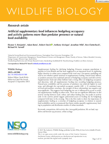 Artificial supplementary food influences hedgehog occupancy and activity patterns more than predator presence or natural food availability.