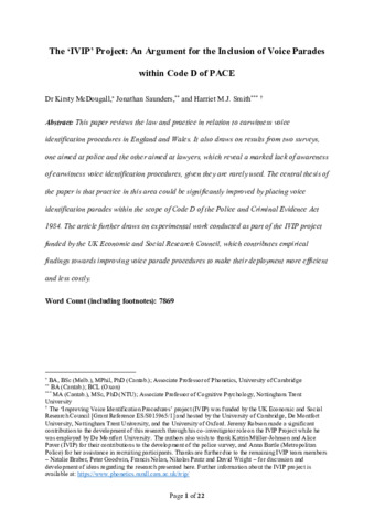 | Rights: | This is a pre-copyedited, author-produced version of an article accepted for publication in The Criminal Law Review following peer review. The definitive published version McDougall, K., Saunders, J., & Smith, H. M. J. (2025). The "IVIP" project: an argument for the inclusion of voice parades within Code D of PACE. Criminal Law Review, 2025(11), 673-686 is available online on Westlaw UK (http://legalresearch.westlaw.co.uk/) |