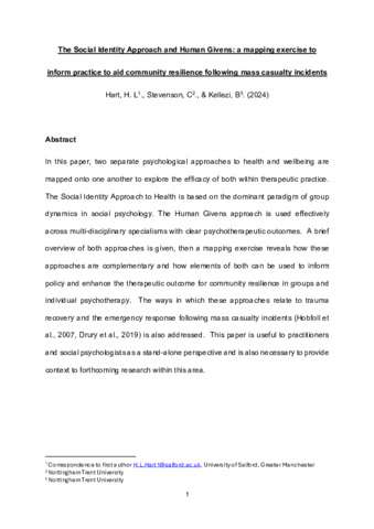 | Rights: | This is a pre-publication version of the following article: Hart, H., Stevenson, C., & Kellezi, B. (2025). The social identity approach and human givens: a mapping exercise to inform practice to aid community resilience following mass casualty incidents. Psychotherapy Section Review, (71), 23-29. https://doi.org/10.53841/bpspsr.2025.1.71.23 |