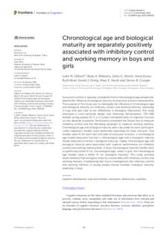 Chronological age and biological maturity are separately positively associated with inhibitory control and working memory in boys and girls.