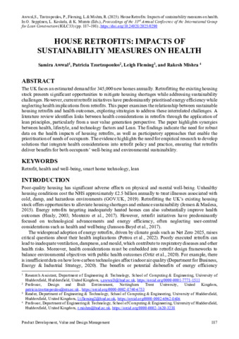 The UK faces an estimated demand for 345,000 new homes annually. Retrofitting the existing housing stock presents significant opportunities to mitigate housing shortages while addressing sustainability challenges. However, current retrofit initiatives have predominantly prioritised energy efficiency while neglecting health implications from retrofits. This paper examines the relationship between sustainable housing retrofits and health outcomes, exploring strategies to address these interrelated challenges. A literature review identifies links between health considerations in retrofits through the application of lean principles, particularly from a user value generation perspective. The paper highlights synergies between health, lifestyle, and technology factors and Lean. The findings indicate the need for robust data on the health impacts of housing retrofits, as well as participatory approaches that enable the prioritisation of needs of occupants. The evidence highlights the need for empirical research to develop solutions that integrate health considerations into retrofit policy and practice, ensuring that retrofits deliver benefits for both occupants’ well-being and environmental sustainability.