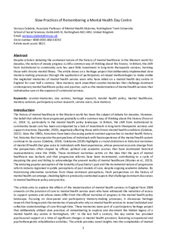 Despite scholars debating the contested nature of the history of mental healthcare in the Western world for decades, the notion of steady progress is still a common way of thinking about this history. In Britain, the shift from institutional to community care has seen little investment in long-term therapeutic services, harming those with chronic mental illness. The article draws on a heritage project that deliberately implemented slow memory-making processes through the application of participatory art-based methodologies to make visible the neglected memories of mental health service users who have relied on a mental health day centre in England for over half a century. Slow memory work unearthed counter-memories that challenge dominant contemporary mental healthcare policy and practice, such as the modernisation of mental health services that individualise care at the expense of communal services.