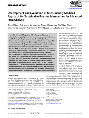 Development and evaluation of user-friendly modeled approach for sustainable polymer membranes for advanced hemodialysis.