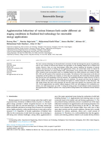 Agglomeration behaviour of various biomass fuels under different air staging conditions in fluidised bed technology for renewable energy applications.