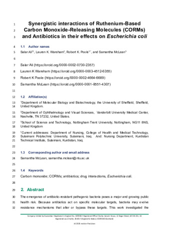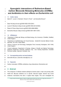 Synergistic interactions of ruthenium-based carbon monoxide-releasing molecules (CORMs) and antibiotics in their effects on Escherichia coli.