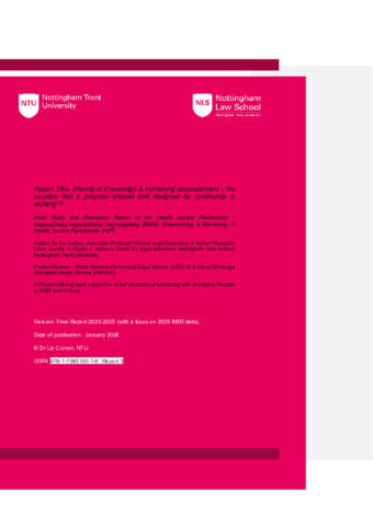 This co-designed evaluation of a health justice partnership between Hume Riverina Community Legal Service and the Albury Wodonga Aboriginal Health Service occurring over three years was conducted by Nottingham Trent University (NTU) and examines the effectiveness of the health justice partnership. Dr Liz Curran from Nottingham Law School (NLS) at NTU, met annually (2023-2025) with Aboriginal people, counsellors, doctors, nurses, financial counsellors, drug and alcohol workers, financial counsellors, psychologists and other people who work with the local Aboriginal community. Dr Curran also gathered feedback from the lawyers in the program and the managers who run each of the health justice partnership.