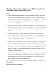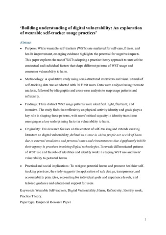 Originality: This research focuses on the context of self-tracking and extends existing literature on digital vulnerability, defined as a state in which people are at risk of harm due to external conditions and personal states and circumstances that significantly inhibit their agency in practices involving digital technologies. It reveals differentiated patterns of WST use and the role of identities and identity work in shaping WST use and users’ vulnerability to potential harms.