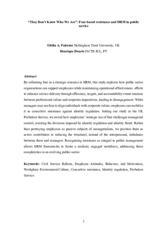 By reframing fear as a strategic resource in HRM, this study explores how public sector organisations can support employees while maintaining operational effectiveness. Efforts to enhance service delivery through efficiency, targets, and accountability create tensions between professional values and corporate imperatives, leading to disengagement. While managers may use fear to align individuals with corporate values, employees can mobilise it as concertive resistance against identity regulation. Setting our study in the UK Probation Service, we reveal how employees’ strategic use of fear challenges managerial control, resisting the divisions imposed by identity regulation and identity threat. Rather than portraying employees as passive subjects of managerialism, we position them as active contributors to reducing the structural, instead of the interpersonal, imbalance between them and managers. Recognising resistance as integral to public management allows HRM frameworks to foster a resilient, engaged workforce, addressing those complexities in an evolving public sector.