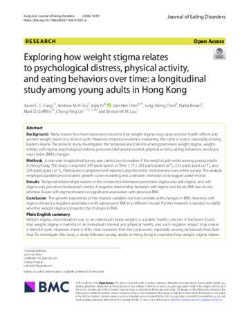 Exploring how weight stigma relates to psychological distress, physical activity, and eating behaviors over time: a longitudinal study among young adults in Hong Kong.