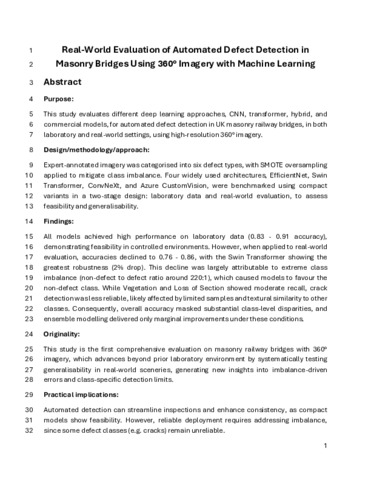 Originality/value: To the best of the authors’ knowledge, this study is the first comprehensive evaluation on masonry railway bridges with 360° imagery, which advances beyond prior laboratory environment by systematically testing generalisability in real-world sceneries, generating new insights into imbalance-driven errors and class-specific detection limits.