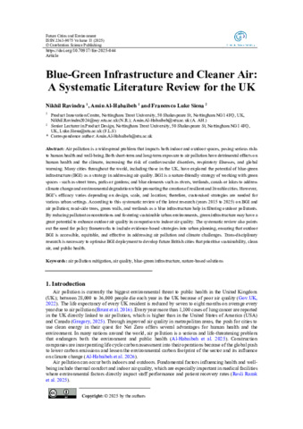 Air pollution is a widespread problem that impacts both indoor and outdoor spaces, posing serious risks to human health and well-being. Both short-term and long-term exposure to air pollution have detrimental effects on human health and the climate, increasing the risk of cardiovascular disorders, respiratory illnesses, and global warming. Many cities throughout the world, including those in the UK, have explored the potential of blue-green infrastructure (BGI) as a strategy in addressing air quality. BGI is a nature-friendly strategy of working with green spaces - such as street trees, parks or gardens; and blue elements such as rivers, wetlands, canals or lakes to address climate change and environmental degradation while promoting the creation of resilient and liveable cities. However, BGI’s efficacy varies depending on design, scale, and location; therefore, customised strategies are needed for various urban settings. According to this systematic review of the latest research (years 2015 to 2025) on BGI and air pollution; road-side trees, green walls, and wetlands as a blue infrastructure help in filtering outdoor pollutants. By reducing pollutant concentrations and fostering sustainable urban environments, green infrastructure may have a great potential to enhance outdoor air quality in comparison to indoor air quality. The systematic review also points out the need for policy frameworks to include evidence-based strategies into urban planning, ensuring that outdoor BGI is accessible, equitable, and effective in addressing air pollution and climate challenges. Trans-disciplinary research is necessary to optimise BGI deployment to develop future British cities that prioritise sustainability, clean air, and public health.