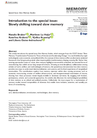 This article introduces the special issue Slow Memory Studies, which emerges from the COST Action “Slow Memory: Transformative Practices for Times of Uneven and Accelerating Change.” In a world defined by rapid technological, socio economic, and political shifts, the concept of slow memory offers an alternative analytical framework that foregrounds gradual, often imperceptible transformations shaping everyday life. Rather than centring spectacular events or crises, slow memory highlights non-eventful, embodied, and situated forms of remembering that unfold across long temporal horizons. Drawing on interdisciplinary collaboration among scholars of work, welfare, and methodologies of memory, this special issue demonstrates how slow memory provides new ways to understand deindustrialization, care systems, and the lived experiences of marginalized communities. The contributions explore how memory operates within slow moving processes such as economic restructuring, erosion of welfare infrastructures, and intergenerational transmission of trauma, showing how these processes remain largely invisible in dominant narratives. By engaging with feminist, participatory, artistic, and curatorial approaches, the articles also illustrate the methodological possibilities of slow memory as an ethical and political practice. Collectively, the issue argues for a reorientation of memory studies toward temporalities of slowness that enable more inclusive, attentive, and socially just forms of remembering.