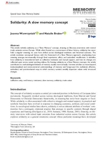 This article rethinks solidarity as a “Slow Memory” concept, drawing on life-story interviews with retired trade unionists across Europe. While often framed as a cornerstone of labor history, solidarity has never held a singular meaning; its uses have shifted across ideological traditions and historical contexts. The article combines conceptual history with the framework of a Slow Memory approach, emphasizing how meaning emerges incrementally through lived experience, affect, and embodied recollection. It identifies how solidarity is remembered both as collective resistance and mutual support, and how its changes are reflected upon across varied working milieus. By framing solidarity as a Slow Memory concept, the article contributes to methodological debates of memory studies more broadly. It invites scholars to move beyond institutionalized and event-centered understandings of memory and foreground the multisited, affective, embodied, and practice-based ways in which memory sustains socially important values amid structural changes.
